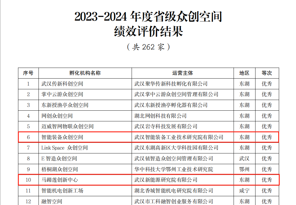在國家備案眾創空間績效評價中,光谷產投運營的“工研育成眾創空間”獲評“優秀”;在省級眾創空間績效評價中,智裝院運營的“智能裝備眾創空間”、新能源研究院運營的“馬蹄蓮創新中心”獲評“優秀”。